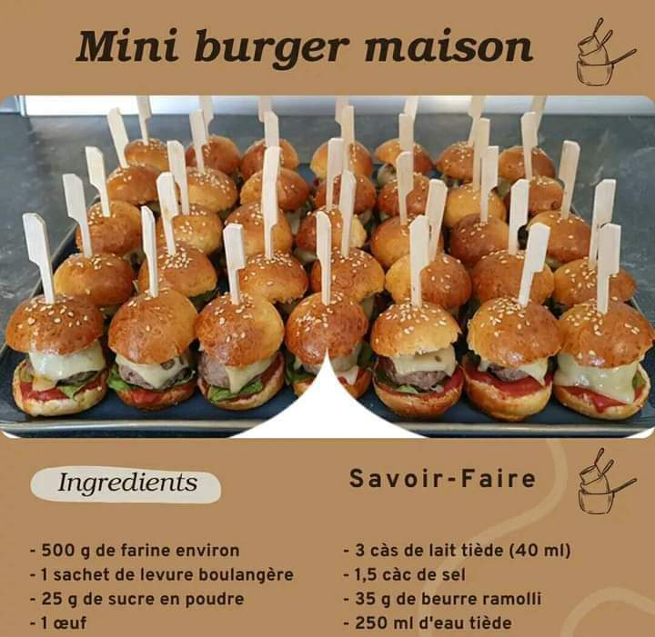 Difficulté : Facile Préparation : 1 h Cuisson : 40 min Ingrédients / pour 10 personnes Pains à hamburger : 500 g de farine environ 1 sachet de levure boulangère 25 g de sucre en poudre 1 œuf 3 càs de lait tiède (40 ml) 1,5 càc de sel 35 g de beurre ramolli 250 … Lire plus