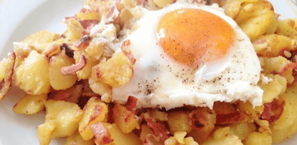 Pommes de terre sautées avec saucisses et œuf au plat