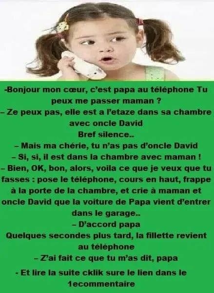 Blague 1 -Bonjour chérie, c’est papa au téléphone Tu peux me passer maman ? – Tu ne peux pas, elle est à l’étage dans sa chambre avec Oncle David Bref silence.. – Mais chérie, tu n’as pas d’oncle David – Oui, oui, il est dans la chambre avec maman ! – Bien, OK, bien, alors … Lire plus