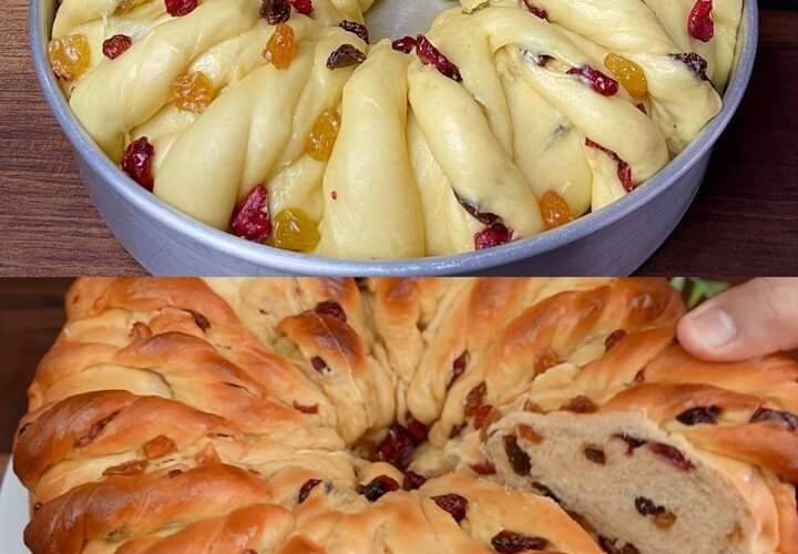 Ce magnifique pain torsadé est parfait pour les fêtes ou toute occasion spéciale. Rempli de canneberges séchées sucrées et de raisins secs dorés, le pain est moelleux, aéré et légèrement sucré, ce qui en fait un ajout délicieux à un petit-déjeuner ou à une délicieuse friandise à l’heure du thé. Le motif torsadé complexe ajoute … Lire plus