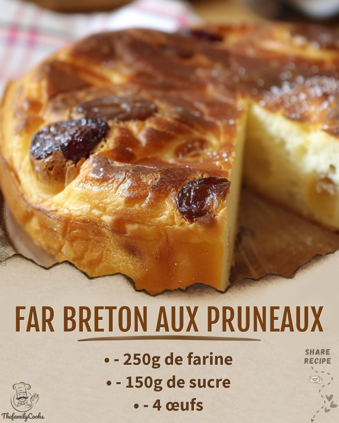 Far Breton aux Pruneaux Ingrédients : – 250g de farine – 150g de sucre – 4 œufs – 1 litre de lait – 1 pincée de sel – 200g de pruneaux dénoyautés – Beurre pour le moule Instructions : Continuer la recette à la page suivante
