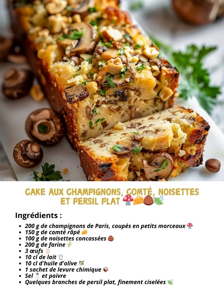 Cake aux Champignons, Comté, Noisettes et Persil Plat 🍄🧀🌰🍃 📋 Ingrédients : 🔸 200 g de champignons de Paris, coupés en petits morceaux 🍄 🔸 150 g de comté râpé 🧀 🔸 100 g de noisettes concassées 🌰 🔸 200 g de farine 🌾 🔸 3 œufs 🥚 🔸 10 cl de lait 🥛 🔸 … Lire plus
