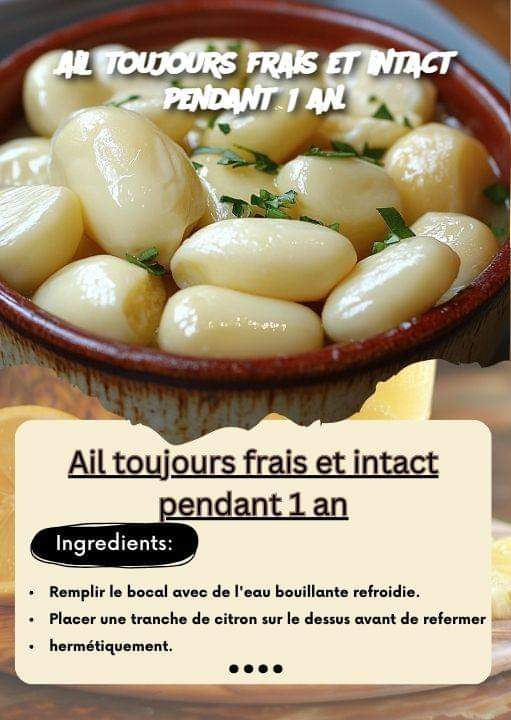 Ail toujours frais et intact pendant 1 an Voici un résumé des principales étapes pour conserver l’ail frais pendant 1 an, une technique connue des cuisiniers avertis : 1. Faire tremper les gousses d’ail dans de l’eau tiède pendant 1 heure pour les ramollir. 2. Épluchage facile des gousses grâce à l’effet de ramollissement. 3. … Lire plus