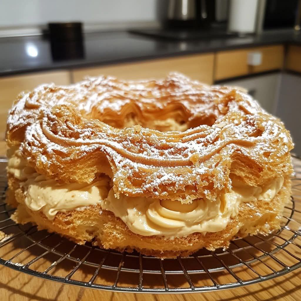 Paris-Brest Ingrédients: Pour la pâte à choux: 25 cl d’eau 70 g de beurre 100g de farine 3 œufs Sel 70g d’amandes effilées Vous pouvez lire aussi Pains au chocolat express Pour la crème: 125g de sucre 80g de praliné 2 blancs d’oeufs 155g de beurre Préparation: lire la suite en page suivante